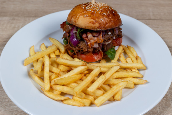 (česneková majonéza, barbecue, polníček, rajče, červená cibulka, slanina)